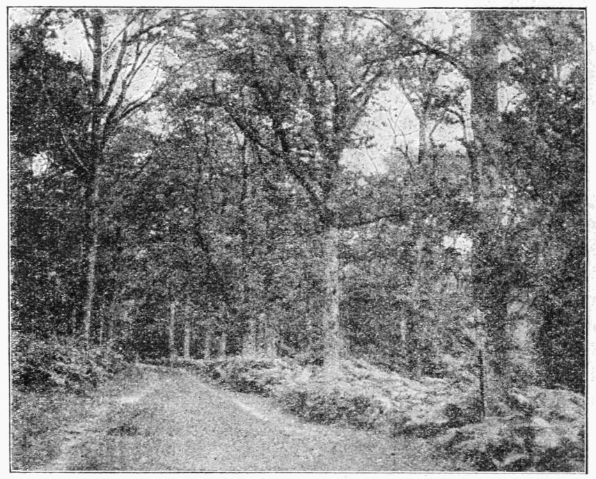 This sugaring business is perhaps the most exciting phase of collecting. Having prepared a fine compound of coarse brown or "foots" sugar, treacle, and beer, by boiling down these ingredients to a suitable liquid condition, this is taken to the scene of action in a sugaring tin, a receptacle fitted with a brush which is fixed in the screw-on top; or the attracting medium may be carried in any kind of convenient bottle providing a paintbrush (sash tool) and a jampot or some such article accompany it. Arrived on the ground, preferably a wood, a ride is selected along each side of which are convenient trees. A glade such as that in the New Forest, photographed by Mr. W. J. Lucas, and reproduced in Fig. 12, is an ideal pitch. Just before using, a very small quantity of rum may be added to the mixture, but if "foots" can be obtained the rum is not required. In the autumn I have found a drop or two of the essence of {12}jargonelle pear, or of ribstone pippin, an effective addition. Now comes the initial stage in the night's venture, the "sugar" is put on each tree in a streak extending downwards about a foot from the level of one's chin; if thin enough to spread easily the mixture is almost certain to run further down the trunk. Whilst employed in this somewhat messy preliminary we meditate on the possible result, and hope that if visitors are not numerous they may at least be select. Lighting the lantern, the first round of inspection of the sugar patches is made, but this may not be altogether encouraging; on only one tree are there any moths and these but three in number, and not uncommon kinds (see Fig. 13). The second and even the third rounds do not {13}give the satisfactory results we had anticipated, and we feel inclined to retire discomfited; but as a sort of forlorn hope we try once again, and this time we secure one or two really good things. Another night moths arrive quite early and in large numbers, chiefly commoners, but with a sprinkling of the better sorts among them. Just what meteorological or other conditions are most conducive to a successful sugaring expedition I have never been able to ascertain. Often blanks have been drawn when the weather has seemingly been the most favourable, and quite as frequently good bags have been made when exactly the reverse was thought to be more likely. If the natural attractions {14}in the way of flowers and "honey dew" abound, the insects may possibly ignore the most tempting bait we can contrive for them. There is much uncertainty in this favourite method of collecting, and whether sugar is put on tree trunks, foliage, palings, rocks, or stones, or smeared on rags, and these hung up on barbed wire fences; or daubed on heads of thistles or bunches of grass heads tied together, one must be prepared to accept the disappointments that are inevitable, however careful we may be in the selection of "suitable evenings." It may be added that newly sugared trees are generally less attractive than those that are frequently painted with the mixture.