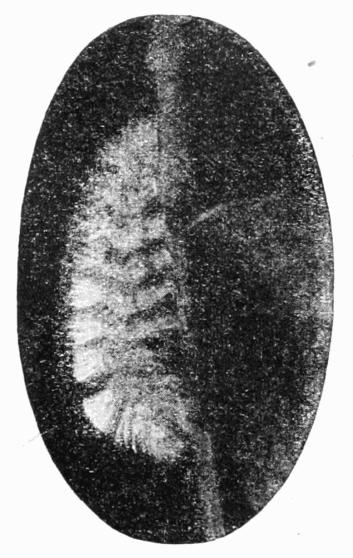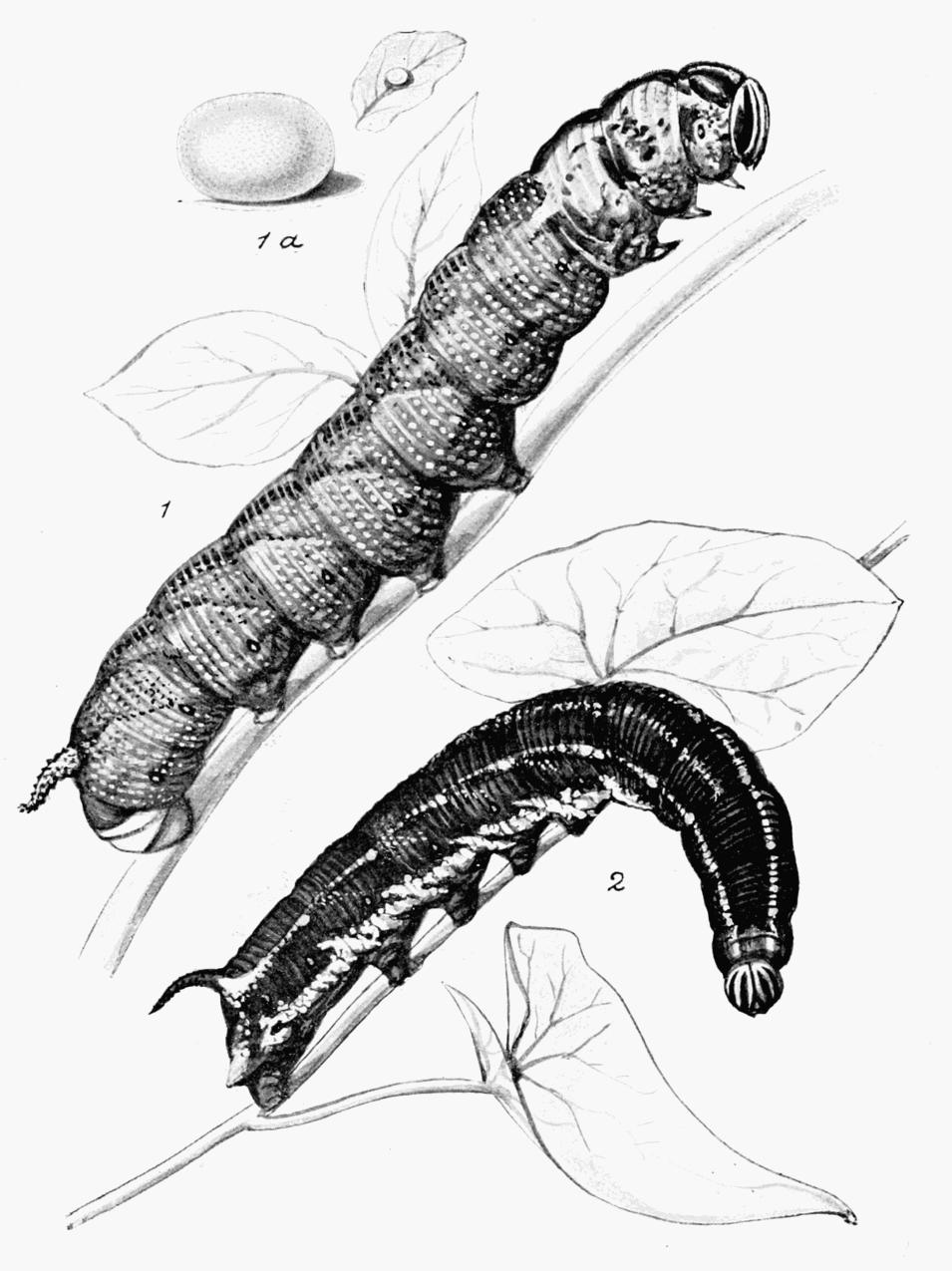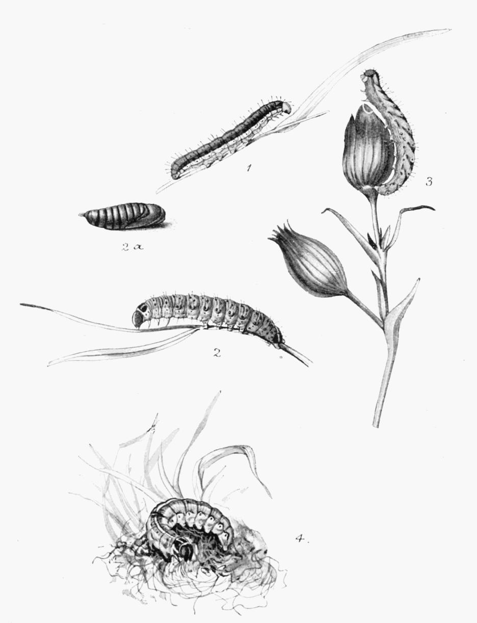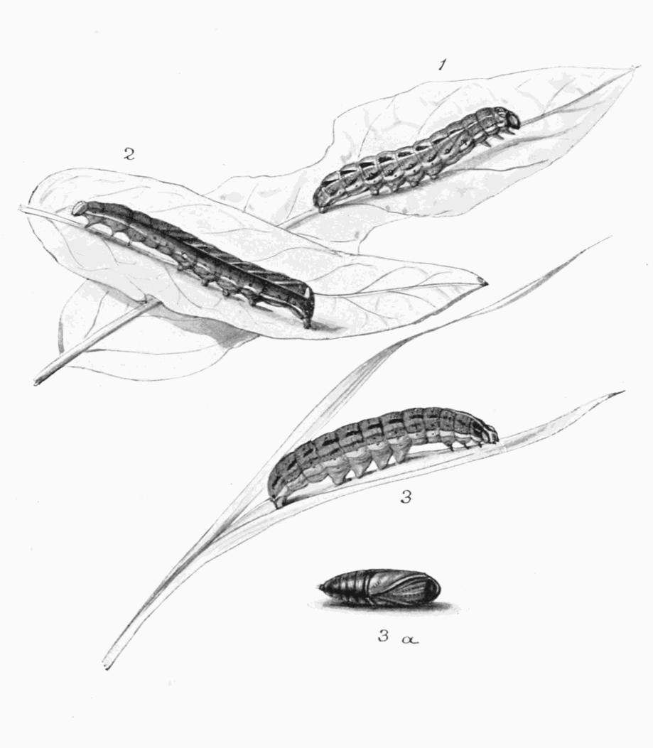 When ready to enter the chrysalis state, the caterpillar burrows from 2 to 4 inches below the surface of the soil, and there forms a large chamber, the walls of which are not very substantial and are easily broken. After resting therein for a week, or two, it turns to a dark brownish, rather glossy, chrysalis. (Plate 11, Fig. 1). The earthen cocoon, frail as it is, seems to be a protection to the chrysalis, guarding it from too much moisture on the one hand, or dryness on the other. I always found that when chrysalids from caterpillars that I have obtained were left undisturbed the moths emerged well enough; but when they were turned up out of the ground by the potato diggers, and, of course, without covering, they were almost certain to perish if the attempt were made to keep them through the winter. In the latter case, the only chance was to endeavour to induce the moth to emerge as soon as possible by bringing them under the combined influence of warmth and moisture.