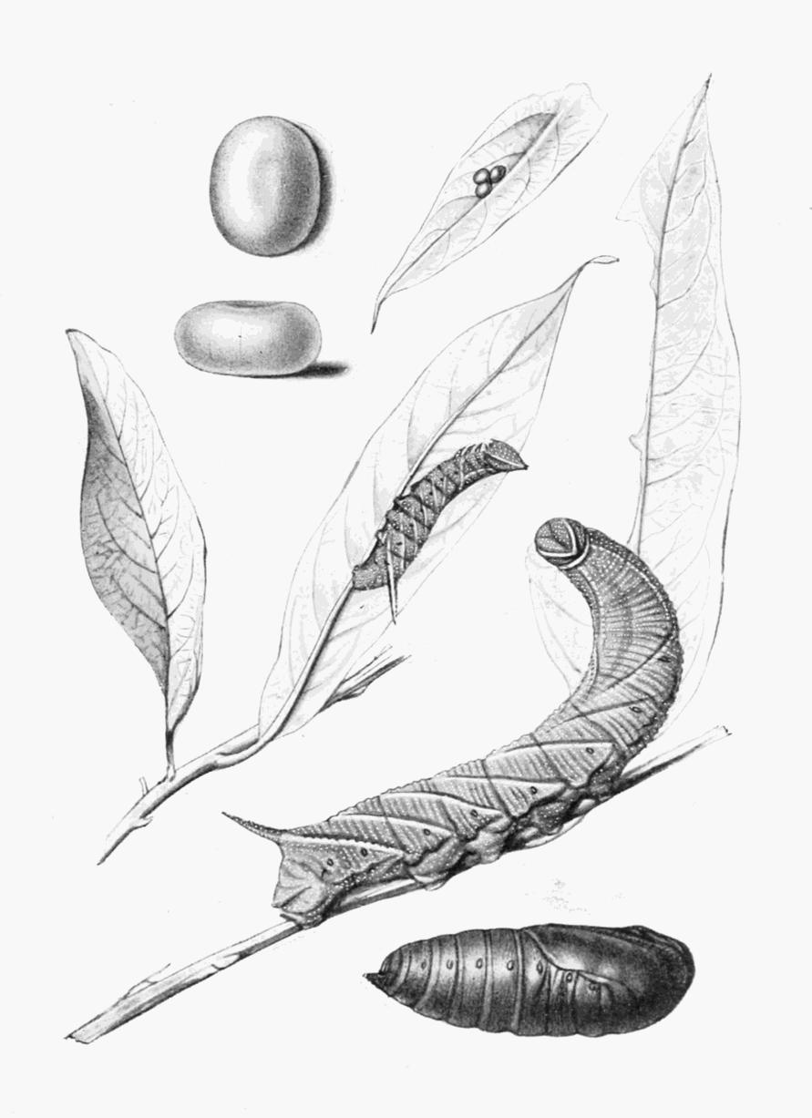 When full grown, the caterpillar attains a length of nearly 5 inches, and is of considerable thickness throughout. Usually {25}the general colour is some shade of green, varying to yellowish, but in some examples it is brown, more or less tinged with violet; others again are of a blackish hue. The seven oblique side stripes are purplish or violet brown, edged with yellowish; they are absent from the three rings nearest the head; the rough, double curved horn is of the body colour. The greenish forms are sprinkled with violet dots, and the brownish forms with white ones. Most frequently found on the leaves of potato; it feeds also on the "tea-tree" (Lycium barbarum), woody nightshade (Solanum dulcamara), and snowberry (Symphoricarpus). Fig. 1, Plate 9, represents the brown form of the caterpillar.