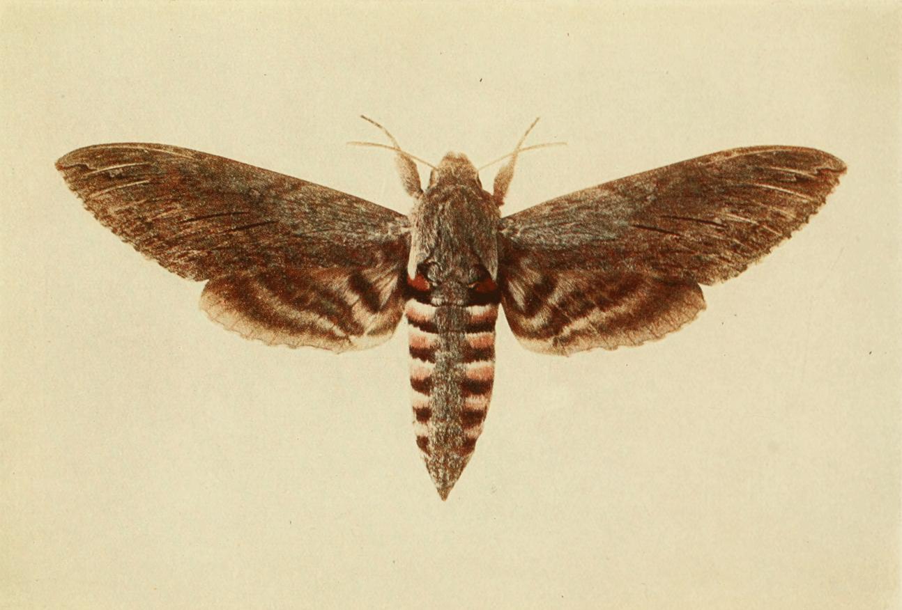 This species was known to Mouffett, who figured it in 1634, but it does not appear to have received an English name until 1773, when Wilkes figured it as the "Jasmine Hawk Moth." Moses Harris, in 1775, called it the "Bee Tyger Hawk Moth," but three years later he changed the name to the Death's Head, the name by which it is still known, although in some {26}parts of England, as well as in Ireland, it is referred to as the "bee robber." In connection with the latter name, it may be mentioned that the moth's "tongue," or proboscis, is short, and not adapted for obtaining sweets, of which it is very fond, from long-tubed flowers, consequently it filches honey from the bees, and, with this object, has been known to enter bee-hives, at least those of the old straw-skep pattern. The moth is also said to have a liking for the sap exuded by wounded trees. Although the species may, perhaps, be with us in certain favoured localities every year, it does not often occur, in any stage, in numbers sufficient to attract general attention. I have not searched the chronicles of Atropos in Britain earlier than 1864, but from these it seems that the species was widely distributed and generally common in 1865, 1868, 1878, 1885, 1896, and 1900. More or less common in certain localities in 1867, 1869, 1870-1872, 1877, 1880, 1882, 1884, 1893, 1895, 1899, 1911, and 1917. In the other years it was scarce, or apparently absent.