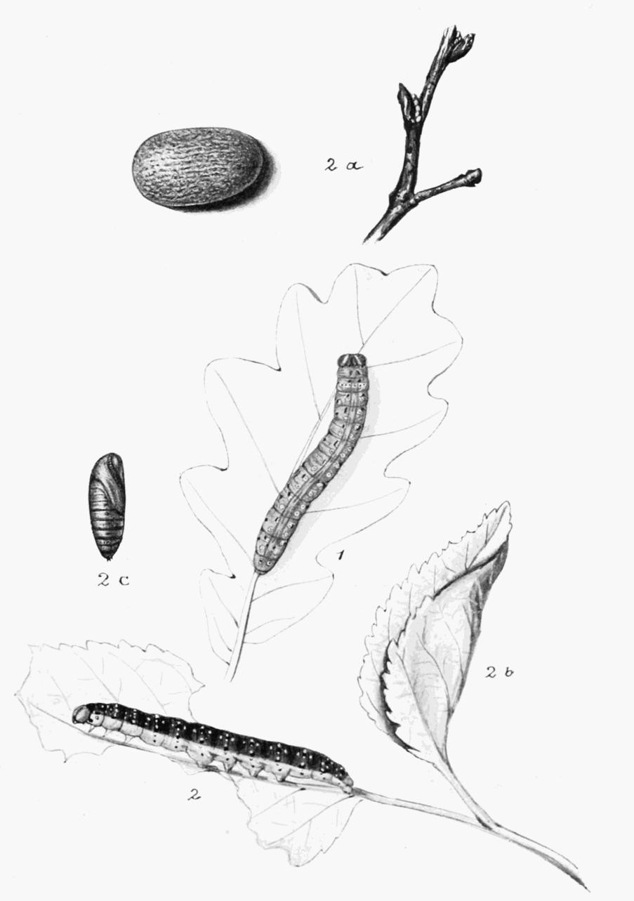 Sallow, willow, and apple are the more general food plants, but poplar and privet have been reported. I have sometimes found the larva on Salix repens, and also on crab-apple (Pyrus malus). It may be found in July and August. In some years, when the moths emerge in May, caterpillars are found as early as June, and this is followed by the occurrence of the caterpillar again, as a second brood, in August and September. When quite mature the caterpillar enters an inch or two into the soil, and there forms a weak sort of cell in which it shortly afterwards turns to a brown, or blackish-brown, smooth and {24}rather glossy chrysalis. The early stages are figured on Plate 6.