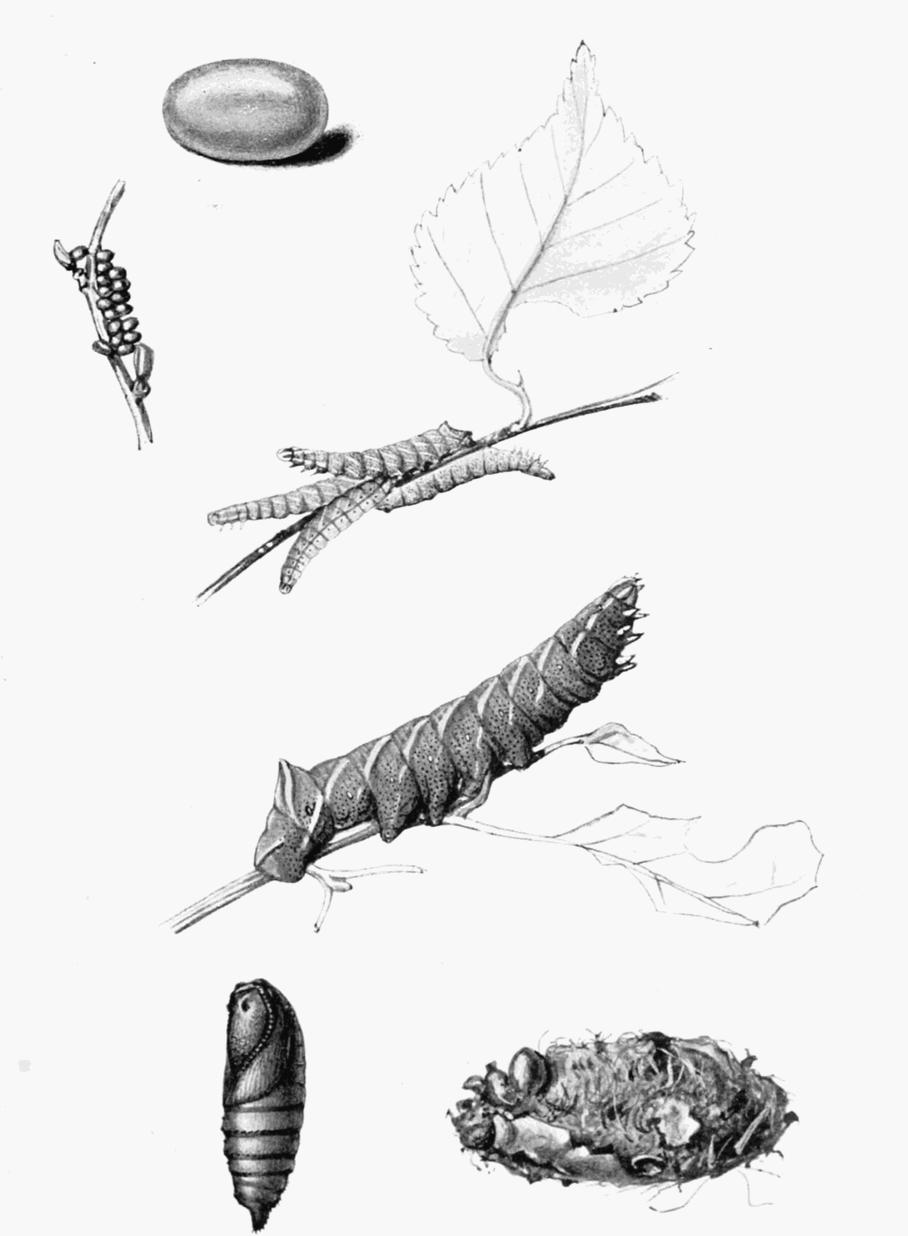 The figure of a nearly full-grown caterpillar (Plate 2) is from a drawing in colour by Mr. A. Sich. Shortly, the caterpillar may be described as green, roughened with yellow points, and with seven yellow oblique stripes on the sides, each edged above with purplish and reddish; the spiracles are ringed with reddish, and the curved horn is blue, inclining to yellowish beneath and at the tip; the roughened shield on the last ring of the body is reddish, marked with yellow. Head triangular, smoother than the body. Quite in its infancy, the caterpillar is a long, thin creature; the horn, which is divided at the tip, is covered with short, stiff hairs, and appears blackish; later on the horn becomes reddish, and the side stripes appear on the body. Although alder, birch, and several other shrubs and trees have been mentioned, there is no doubt that the foliage of elm and lime is the chief food of the caterpillar in a state of nature. Found in July and August.