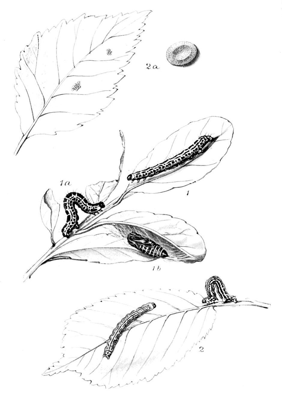 The caterpillar is green, with whitish warts emitting fine hairs, and has three lines along the back, the central one white and stripe-like; a yellow stripe low down along the sides is edged above with black. It feeds in April and May on elm, oak, apple, plum, etc., among the leaves of which it hides by day, and may be dislodged therefrom by jarring the boughs. (Plate 3, Fig. 2, after Hofmann.)