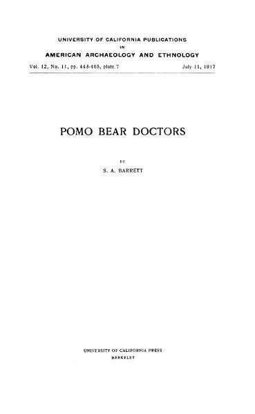 The Project Gutenberg EBook of Pomo Bear Doctors, by Samuel Alfred Barrett This eBook is for the use of anyone anywhere at no cost and with almost no restrictions whatsoever. You may copy it, give it away or re-use it under the terms of the Project Gutenberg License included with this eBook or online at www.gutenberg.org Title: Pomo Bear Doctors Author: Samuel Alfred Barrett Release Date: June 18, 2013 [EBook #42979] Language: English Character set encoding: UTF-8 *** START OF THIS PROJECT GUTENBERG EBOOK POMO BEAR DOCTORS *** Produced by Charlene Taylor, Paul Clark, Bryan Ness and the Online Distributed Proofreading Team at http://www.pgdp.net (This file was produced from images generously made available by The Internet Archive/American Libraries.)