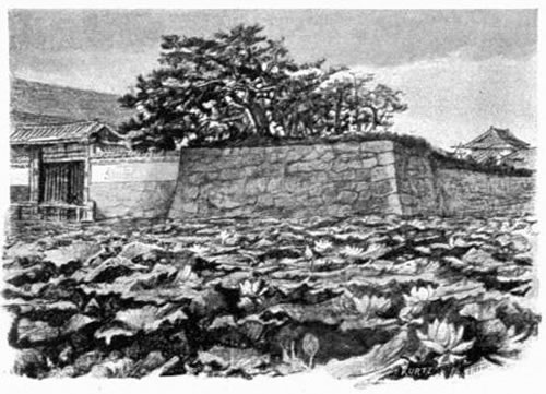 In the first street where the tramway runs there are semi-European façades to houses, and in their pilasters the Ionic capital has at length made the circle of the world. Then we took more Oriental and narrower streets, through the quarter of the gei-sha, the dancers and singers who go out perpetually to put a finishing touch on entertainments. At such early hours they are of course unseen. Where houses seemed more closed than usual servants were attending to household duties, and we heard the occasional strum of a guitar. Then great streets again, with innumerable low houses, the usual shops, like [Pg 13] open sheds, with swinging signs carved, painted, and gilded, or with draperies of black cloth marked with white characters. Merchants sat on their mats among the crowded goods, girls at corners drew water from the wells; in a narrower street the black streak of a file of bulls peacefully dragging merchandise; where the crowd was thickest a black-lacquered palanquin, all closed, in which was shut some obstinate adherent to ancient fashions. Then bridges and canals, and great empty spaces, long white walls with black copings, and buildings that continued the walls, with gratings like those of barracks. These were the yashikis—inclosed residences of princes who were formerly obliged to spend part of the year at the seat of government with small armies of retainers. Then the walls of the castle, great sloping ramparts of irregular blocks of masonry, about which stand strangely twisted pine-trees, while the great moats of clouded water are almost filled with the big leaves of the lotus. Now and then great gates of gray wood and enormous doors. On some of the wide avenues we met cavalry officers in European costume, correct in style, most of the younger with straggling mustaches, long and thin, whence their nickname of "horn-pouts," naturally connected with that of the "cats," devourers of fish, as the gei-sha are called. Near official buildings we saw a great deal of black frock-coats, and trousers, and spectacles. Everything was seen at a full run, our runners dragging us at horse's pace. Still it was long before we reached our destination. Streets succeeded streets, empty or full, in desolate Oriental wearisomeness. At length we stopped at a little gate in a plank fence, and entered a vast high space, formerly a prince's park, at one end of which we saw trees and hills, and we came to the Professor's house, a little European structure. My mind is yet too confused with many impressions to tell you of what we saw that afternoon[Pg 14] and evening, and what was said; all the more that the few beautiful paintings we looked at out of the great collection lifted me away from to-day into an indefinite great past. I dislike to use analogies, but before these ancient religious paintings of Buddhist divinities, symbolical of the elements or of protective powers, whose worn surfaces contained marvels of passionate delicacy and care framed in noble lines, I could not help the recall of what I had once felt at the first sight of old Italian art.
