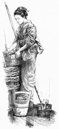 It was too hot and we were too tired to go out and see the town, noisy with the excitement of a festival. The Doctor directed the preparation of a meal on a Japanese basis of rice, mingled and enlivened with the contents of various cans; and meanwhile I went down another little staircase of cleanly white wood, at the farther end of our apartment, to our little private bath-room below.