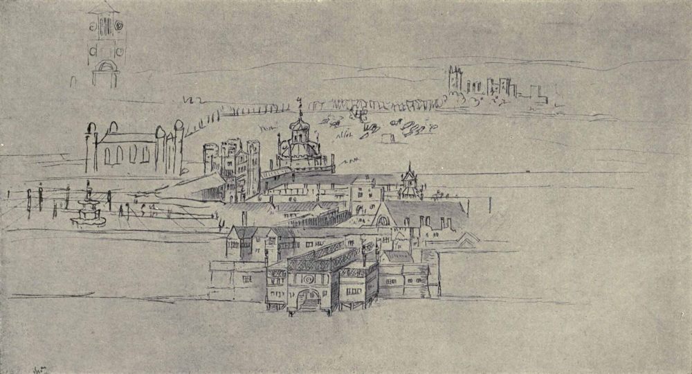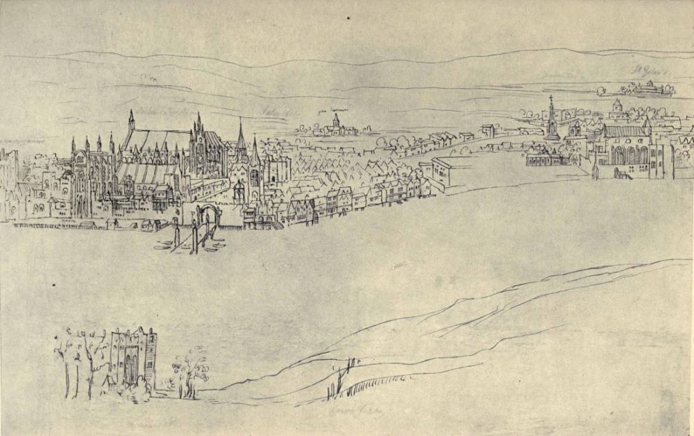 | Of this Flemish artist very little is known. There exists a rescript of Philip II. addressed to Margaret of Parma, regent of the Low Countries, giving him permission to remove with his goods and to settle in Spain, from which it is supposed that he was in the King’s service. The drawing was made, probably for Philip, before the fall of the spire of St. Paul’s in 1561. It is unfinished, blank spaces being left for Whitehall, Bridewell, and some other buildings. There are also memoranda on the drawing which show that the artist intended to colour it, leaden roofs, for instance, being marked “blau.” The Bodleian Library possesses forty-seven other drawings of his, two of which are here reproduced: one of Whitehall, intended no doubt to fill the blank space in the large view, and one of Greenwich Palace from the Observatory Hill, which is coloured in a simple manner. It is not improbable that Wyngaerde left England on the death of Queen Mary. A copy of the drawing of London, much altered and embellished, was made and engraved by N. Whittock in 1849. | |