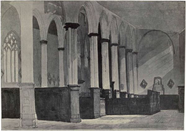Mediæval London had thus begun, but still the recorded details of its history for a while are scanty; and there are few remains of Saxon London either. The first cathedral of Mellitus, probably of wood, was burned in 961; so was its successor in a great fire of 1084. There are here and there a few Saxon churches remaining in England, such as Bradford-on-Avon in Wilts, and Corhampton in Hants. It is not to be wondered at that there is not one in London, though there were then many. Maurice, whom William the Conqueror made Bishop of London, began a new cathedral in 1086, of course in the usual Norman style, with round arches and heavy pillars, such as may still be seen in the transepts of Winchester. But two hundred years passed before it was completed, and as it was always the custom in the Middle Ages to carry on building, or to make repairs and restorations, in the style of architecture in vogue at the moment, St. Paul’s became, like nearly all our English cathedrals, a composite building, exhibiting not only Norman, but Early English and Early Decorated. This cathedral was enclosed by a wall in which were six gates. The names of two of these are preserved in the names of “Paul’s Chain” and “St. Paul’s Alley.”