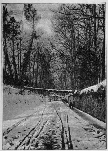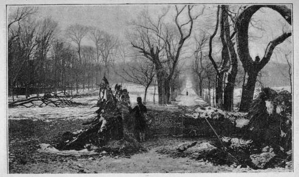 Owing to the elevated position in which the house stood the conflagration was visible at a great distance, and in spite of the weather, large numbers of people visited the spot, although the journey thither, under the circumstances, was one of the most difficult it is possible to conceive. To those who ventured on the walk, however, the sight presented was an extraordinarily impressive one. The flames raged like the blast of a furnace, and the mingling of smoke, sparks and snow-dust produced an effect that was as novel as it was terrible. Sparks from the burning building were carried immense distances, and beaten, with the snow-powder, against the windows of houses that faced the burning villa. Standing at a distance of nearly a mile, with eyes fixed on the blaze, it was impossible to believe that the roar of the fire could not be heard, so nearly did the howling and surging of the wind resemble the roar caused by a great volume of rushing flame.