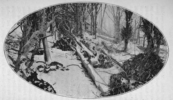 During the whole time the blizzard was raging, the wind varied from N.E. to S.E. The changes were very rapid, but this was the widest range. Along the coast the greatest severity appears to have been experienced from a point or two eastward of Teignmouth to Falmouth Bay, many towns exposed to the sea having to bear their share of the burden, and unhappily many valuable lives being lost through disastrous wrecks. If a map of the three counties of Devon, Cornwall, and Somerset be consulted, it will be found that, taking this portion of the coast as an opening through which the broad shaft of a hurricane entered, now sweeping in a north-easterly, and now in a south-easterly direction, the area of country that has sustained the heaviest damage will be embraced, the intensity of the violence inflicted gradually diminishing the further one travels towards the east, north, and west. Dartmoor forms a kind of centre of the chief scene of desolation, and Plymouth, being well within the range, has suffered far more severely than any other large town in the three counties. To the eastward, in particular, it is clear that the effects of the gale are not nearly so serious, though the fall of snow was pretty abundant all over the southern part of England. Outside[7] of Devon and West Cornwall there are no great lots of timber down, though here and there a fallen tree is observable.