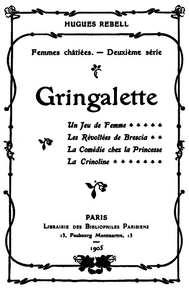 The Project Gutenberg EBook of Gringalette, by Hugues Rebell This eBook is for the use of anyone anywhere at no cost and with almost no restrictions whatsoever. You may copy it, give it away or re-use it under the terms of the Project Gutenberg License included with this eBook or online at www.gutenberg.org/license Title: Gringalette Author: Hugues Rebell Release Date: September 21, 2013 [EBook #43782] Language: French Character set encoding: ISO-8859-1 *** START OF THIS PROJECT GUTENBERG EBOOK GRINGALETTE *** Produced by the Online Distributed Proofreading Team at http://www.pgdp.net (This book was produced from scanned images of public domain material from the Google Print project.)