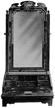 The Queen Anne style has probably been over-praised, a little misunderstood, and possibly a trifle harshly treated. Mr. Ernest Law, whose studies of this period we have already mentioned, describes it as "nothing better than an imitation of the bastard classic of Louis XIV., [9] as distinguished from the so-called 'Queen Anne style' which never had any existence at all except in the brains of modern æsthetes and china maniacs," and as a case in point refers to Queen Anne's drawing-room at Hampton Court Palace. This verdict is no doubt a true one as regards the schemes of interior decoration, with their sprawling deities and the gaudy and discordant groupings of classical figures of Verrio and his school, to be seen at Hampton Court and other great houses. Verrio, as Macaulay wrote, "covered ceilings and staircases with Gorgons and Muses, Nymphs and Satyrs, Virtues and Vices, Gods quaffing nectar, and laurelled princes riding in triumph"—a decorative scheme which certainly does not err on the side of parsimony. The taste of a Court, however, is by no means a criterion of taste in domestic furniture. There can be no doubt that to this period we are indebted for the introduction of various articles of furniture of great utility and unquestionable taste. The chairs and tables in particular, depending as they do for charm upon simple lines and the transverse grain of the wood, for neatness of design and good workmanship are unsurpassed. Amongst other pieces the bureaux and long-cased clocks made their appearance; also double chests of drawers or tallboys, mirrors for [10] toilet-tables and wall decoration; and washstands came into general use, as well as articles like card-tables, powdering-tables, &c.