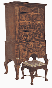 The period from William and Mary to George I. covered nearly forty years, during which the fashionable furniture was generally made from walnut-wood. No doubt walnut was used before the time of William and Mary, notably in the making of the well-known Stuart chairs with their caned backs and seats, but it did not come into general use until the time of William. It continued in fashion until the discovery of its liability to the attacks of the worm, combined with the advent of mahogany, removed it from public favour. Walnut nevertheless remains a beautiful and interesting wood, and in the old examples the colour effects are probably unsurpassed in English furniture. Its liability to "worming" is probably exaggerated, and in the event of an attack generally yields to a treatment with paraffin. Certainly the furniture of what is termed the "Queen Anne period" is in great request at the present day, and as the period was so short during which it was made, the supply is necessarily limited.