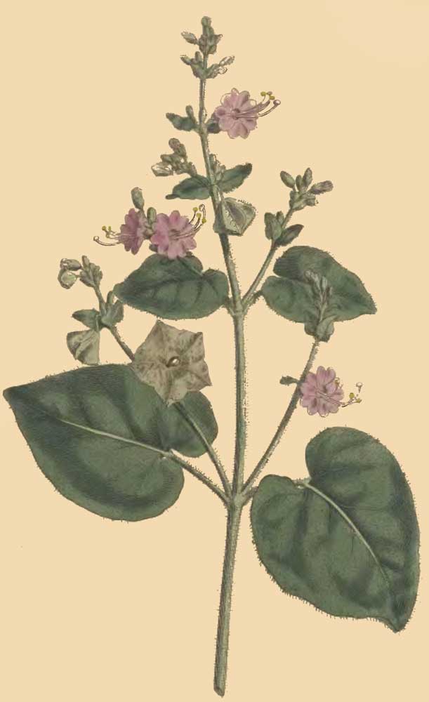 It is an annual, growing to about the height of two feet; the whole plant is viscous, and, if bruised, smells somewhat disagreeably; the flowers do not open at any particular time as those of the Mirabilis do, and each contains only three stamina; when they fall off, which they do soon after expanding, the calyx closes on the germen, enlarges, droops, and becomes deeply plaited; on the ripening of the seed it turns brown, expands, and is suspended like a little umbrella over the seed, which when perfectly ripe drops out on the ground; the expanded calyx in this state appears somewhat like the flower of a Physalis.