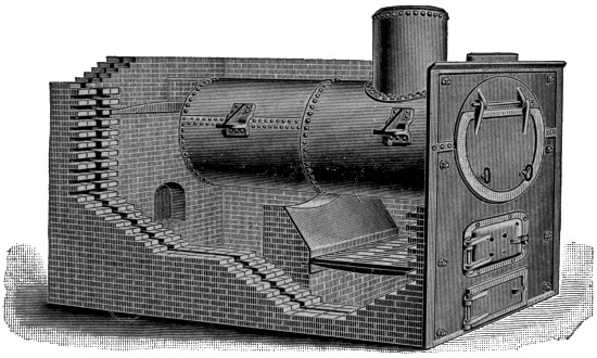 The first boilers were made as a single cylinder of wrought iron set in brick work, with provision for a fire under one end. This was used for many years, but it produced steam very slowly and with great waste of fuel.