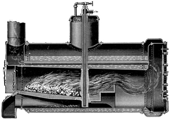 The first improvement to be made in this was a fire flue running the whole length of the interior of the boiler, with the fire in one end of the flue. This fire flue was entirely surrounded by water.