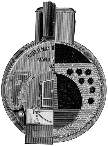 The Port Huron traction engine is of the direct flue locomotive type, built either simple or compound, and of medium weight and excellent proportions for general purpose use. The compound engine (tandem Woolf cylinders) is especially recommended and pushed as more economical than the simple cylinder engine. As live steam can be admitted to the low pressure cylinder, so turning the compound into a simple cylinder engine with two cylinders, enormous power can be obtained at a moment’s notice to help out at a difficult point.