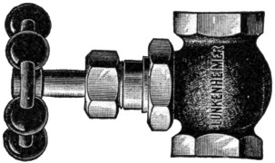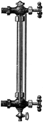 There is a cock at each end of the glass tube. When these cocks are open the water will pass through the lower into the glass tube, while steam comes through the other. The level of the water in the gauge will then be the same as the level of the water in the boiler, and the water should never fall out of sight below the lower end of the glass, nor rise above the upper end.
