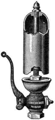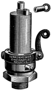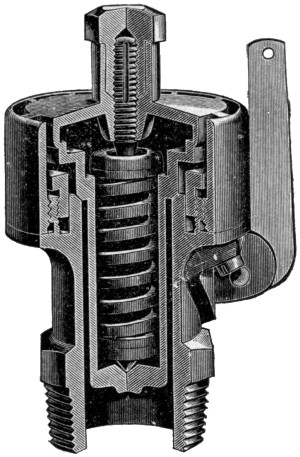 The safety valve is a valve held in place by a weighted lever2 or by a spiral spring (on traction engines) or some similar device, and is adjustable by a screw or the like so that it can be set to blow off at a given pressure of steam, usually the rated pressure of the boiler, which on traction engines is from 110 to 130 pounds. The valve is supplied with a handle by which it can be opened, and it should be opened occasionally to make sure it is working all right. When it blows off the steam gauge should be noted to see that it agrees with the pressure for which the safety valve was set. If they do not agree, something is wrong; either the safety valve does not work freely, or the steam gauge does not register accurately.