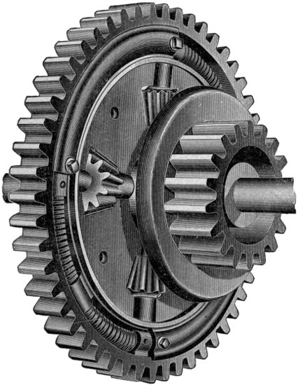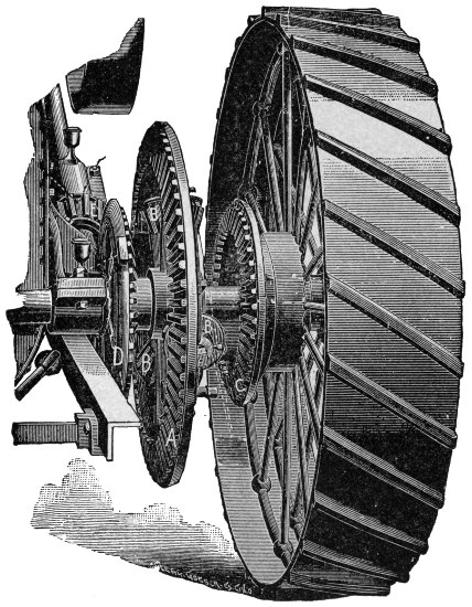 The traction gear is of the spur variety, adjusted to be evenly distributed to both traction wheels through the compensating gear, and to get the best possible pull in case of need.