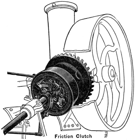 The side gear is used with a crank disc instead of arm. The reverse is the Grime, a single eccentric with device for shifting for reverse. The friction clutch has unusually long shoes, working inside the flywheel, with ample clearance when lever is off. A specialty is made of extra wide traction wheels for soft country. The traction gear is of the spur variety. There is also a double speed device offered as an extra.