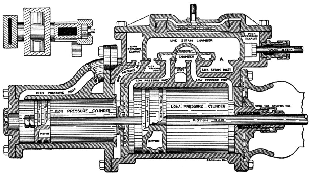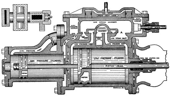 The same is equally true of the cross compound, which has the advantage of using the steam expansively in the low pressure cylinder. In case of need the live steam may be introduced into the low pressure cylinder, enormously increasing the pulling power of the engine for an emergency, though the capacity of the boiler does not permit long use of both cylinders in this way.