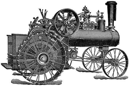 The most striking peculiarity is that the engine is mounted on the boiler differently from most side crank traction engines, the cylinder being forward and the shaft at the rear. This brings the gearing nearer the traction wheels and reduces its weight and complication.