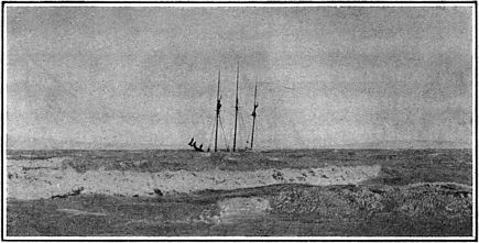 “The keeper was now satisfied that there was no living being on board the wreck. Nothing could be accomplished by additional efforts to effect communication by means of the gun, and the fury of the surf was so overwhelming that none of the men, familiar as they were with the conditions, of long15 experience on the coast, and brave as they had often proved themselves, even so much as entertained the thought of launching the boat. It was out of question, absolutely and beyond all possibility of cavil. The slatting of the distant sails is described as sounding like peals of thunder, and the crashing of blocks and chains as they were flung back and forth against the wire rigging and iron foremast, sent out volumes of blazing sparks that seemed like signals of distress.