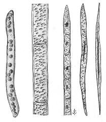 Yellowish brown, conspicuously fibrous, moderately thin walls, central canal broken by joints.
