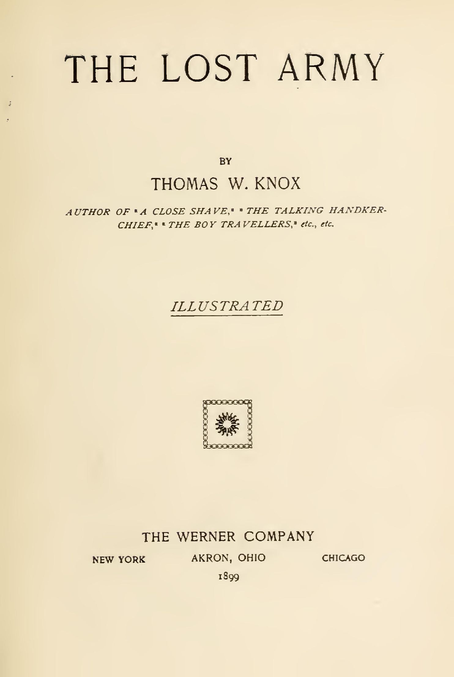 The Project Gutenberg EBook of The Lost Army, by Thomas W. Knox This eBook is for the use of anyone anywhere at no cost and with almost no restrictions whatsoever. You may copy it, give it away or re-use it under the terms of the Project Gutenberg License included with this eBook or online at www.gutenberg.org Title: The Lost Army Author: Thomas W. Knox Release Date: March 7, 2014 [EBook #45071] Last Updated: March 15, 2018 Language: English Character set encoding: UTF-8 *** START OF THIS PROJECT GUTENBERG EBOOK THE LOST ARMY *** Produced by David Widger from page images generously provided by The Internet Archive