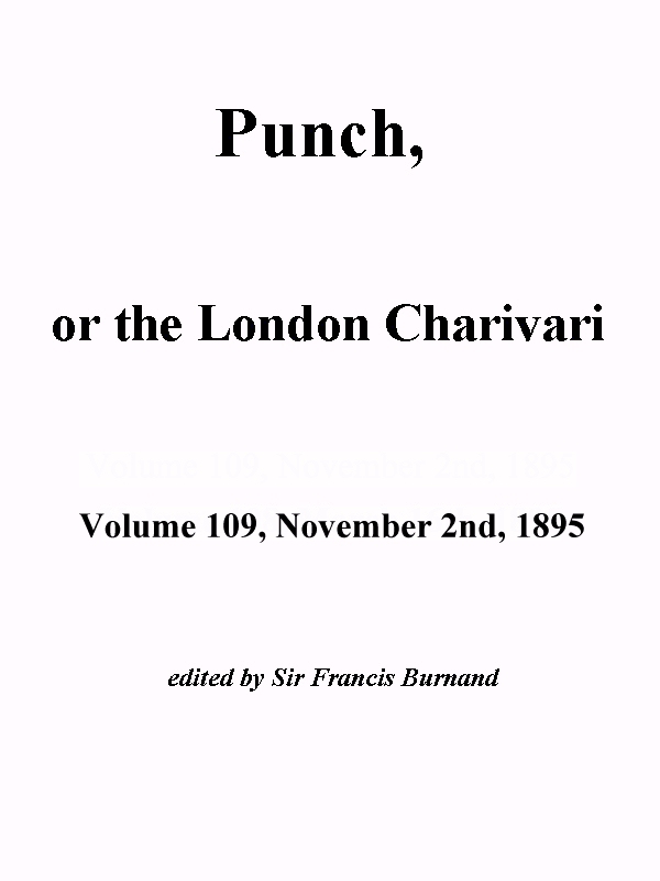 The Project Gutenberg EBook of Punch, or the London Charivari, Vol. 109, November 2nd, 1895, by Various This eBook is for the use of anyone anywhere at no cost and with almost no restrictions whatsoever. You may copy it, give it away or re-use it under the terms of the Project Gutenberg License included with this eBook or online at www.gutenberg.org/license Title: Punch, or the London Charivari, Vol. 109, November 2nd, 1895 Author: Various Editor: Sir Francis Burnand Release Date: April 15, 2014 [EBook #45399] Language: English Character set encoding: ISO-8859-1 *** START OF THIS PROJECT GUTENBERG EBOOK PUNCH, VOL. 109, NOVEMBER 2ND, 1895 *** Produced by Punch, or the London Charivari, Malcolm Farmer, Lesley Halamek and the Online Distributed Proofreading Team at http://www.pgdp.net