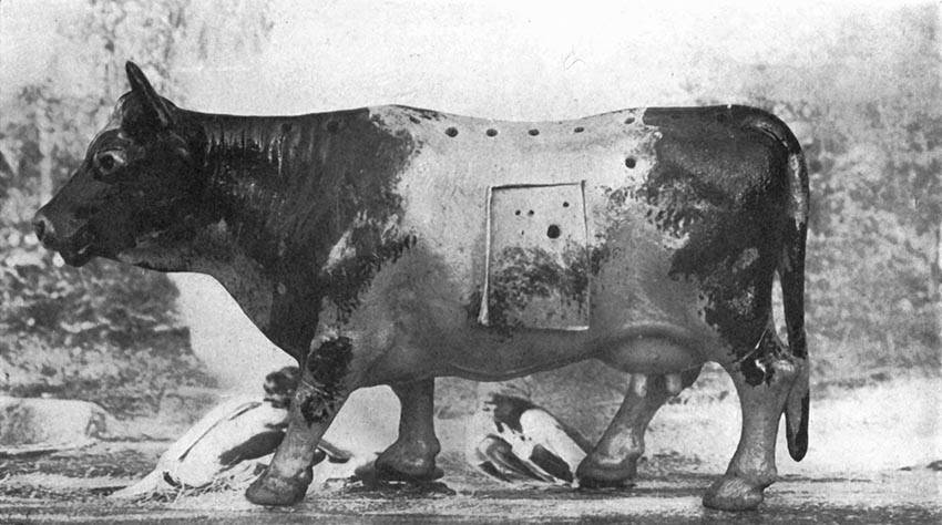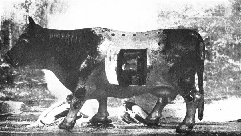 Messrs. Newman built a huge dummy cow fifteen feet in height of papier-mâché. The operator stands inside with his camera and the pictures are taken through a small hinged door. With this "property" dangerous animals can be approached closely.