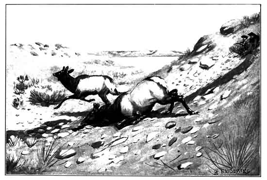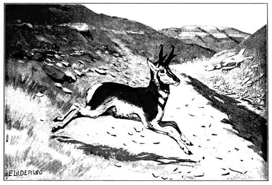 "When we see an old doe antelope by herself on the prairie at about the season of the year when the young are born, we watch her and we can tell pretty well whether she has a young one or not. If we think she has a kid, we can get some idea of where it is hidden by the way the mother acts. Then the only way to find it is to go to the place and search the ground over foot by foot, until the young one is found or the task is given up. Usually both kids will be found side by side, but sometimes they are three or four feet apart. When they are taken up, they do not struggle or try to get away. They hang perfectly limp, and if you try to make them stand up, their legs give way under them and they sink down again. It is often twenty-four hours before they seem to take any interest in what is going on 10 about them, but when they get hungry, and after they have once drunk some milk, they are tame, and as soon as they become strong, very playful. Young antelope are not always easily reared, but young deer and elk are more hardy. If a buffalo calf is caught it can be given to a cow to rear. Wolf or coyote puppies can be reared on a bottle. Those animals do not easily become tame and trustful. They are likely to be shy and to dodge and jump away if any sudden motion is made, but when they are pleased, when any one in whom they have confidence approaches them, they lay back their ears and wag their tails and wriggle their bodies just like an affectionate dog. Once we had a young bear at the ranch for a year and a half, and he was an amusing pet. If you gave him a bottle of milk he would stand on his hind legs, and holding the bottle in both hands he would tilt it up and let the milk trickle down his throat until the bottle was empty, when he would throw it away."
