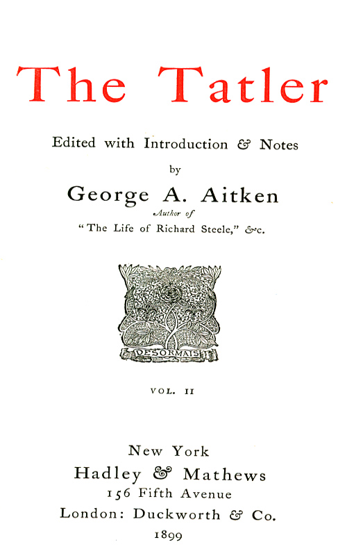 The Project Gutenberg EBook of The Tatler, Volume Two, by Various This eBook is for the use of anyone anywhere at no cost and with almost no restrictions whatsoever. You may copy it, give it away or re-use it under the terms of the Project Gutenberg License included with this eBook or online at www.gutenberg.org/license Title: The Tatler, Volume Two Author: Various Editor: George A. Aitken Release Date: May 26, 2014 [EBook #45769] Language: English Character set encoding: ISO-8859-1 *** START OF THIS PROJECT GUTENBERG EBOOK THE TATLER, VOLUME TWO *** Produced by Richard Tonsing, Jonathan Ingram, and the Online Distributed Proofreading Team at http://www.pgdp.net