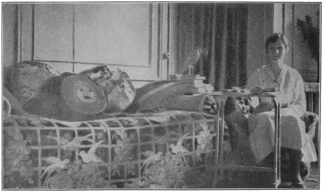 For chairs, I have one armchair of imitation red leather, which is stiff and smooth and cold, but when I cover it over with my two sweaters to take the edge off, as it were, it does very well. Then there are two little chairs made so that you sit on them diagonally,—I’ve always thought them an abomination,—but I never sit in them, just spread my clothes out on them at night. Then I have a small straight chair which goes with the little table that serves as desk.