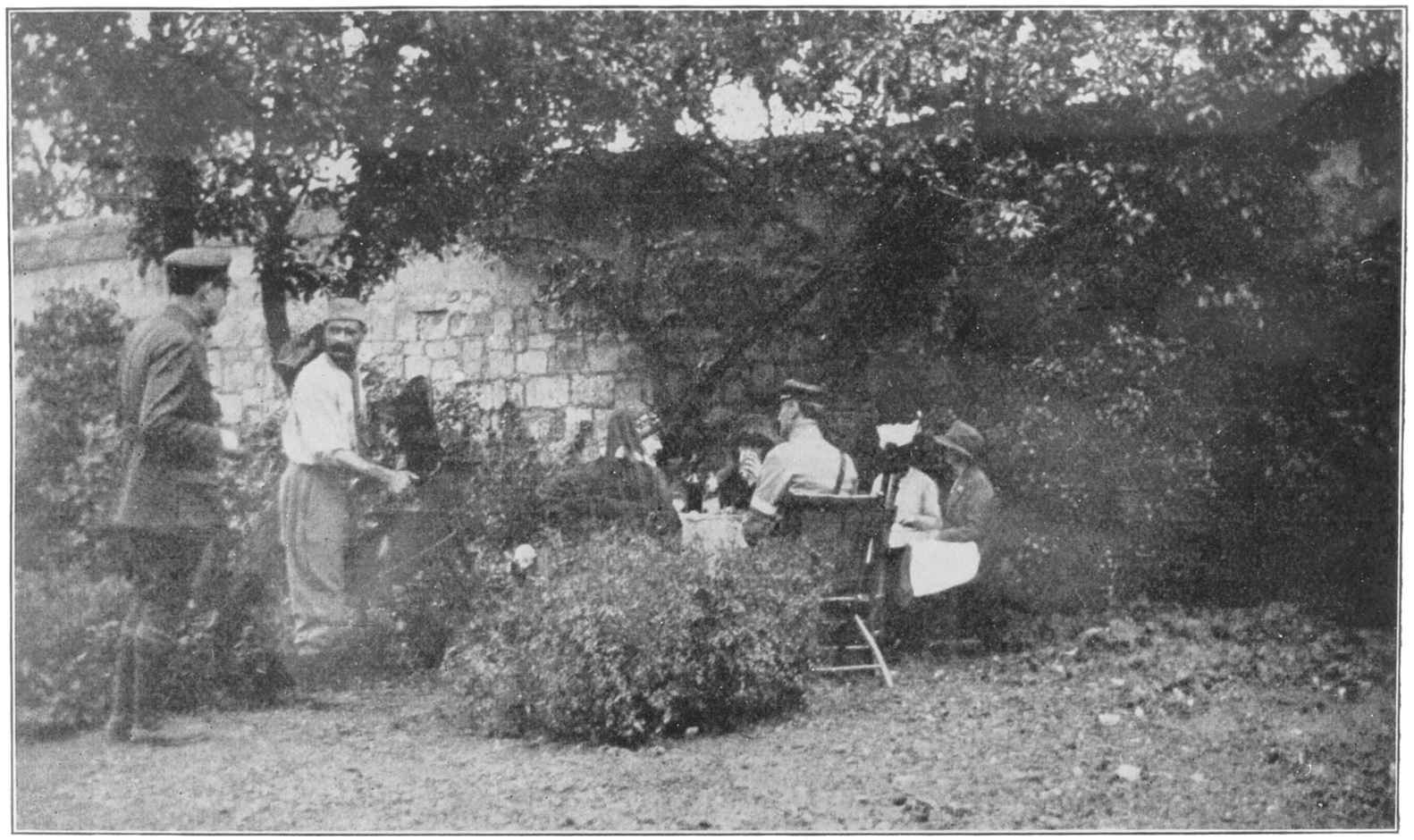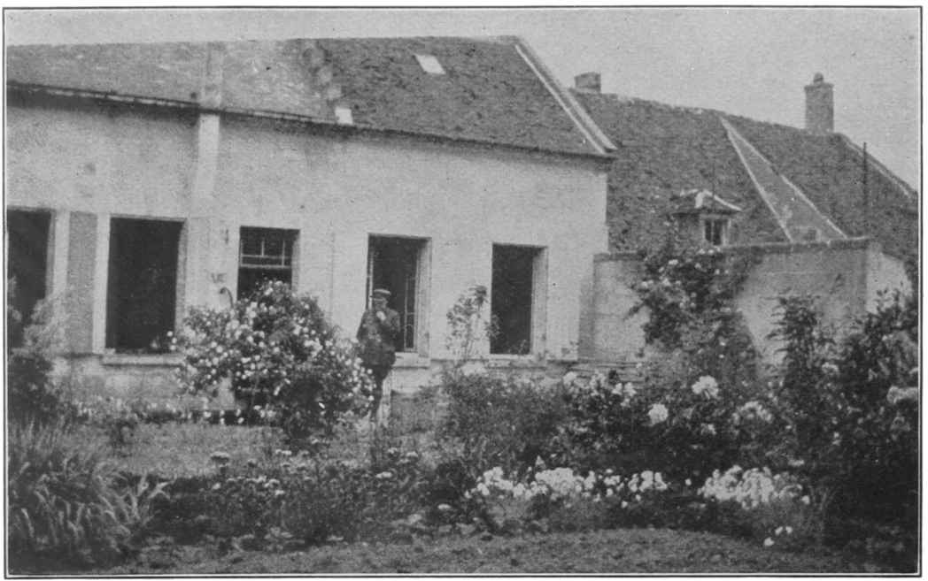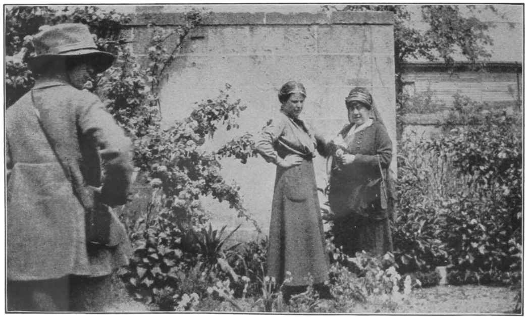 After we had waved them off, and wished them luck, we turned to the chateau. It is quite near the station, so a little donkey named Kee Kee carries the bags up, and you walk a short way until you enter the estate. It is beautiful; all shade trees, with a spring you have to cross on stepping-stones, and such ivy and bushes and flowers! There are two houses—the more modern larger one, which has the dining-room and kitchen and library and big bedrooms, and then the old one, dating way, way back, where we are, and which is charming. The W——s put all their time and money into the grounds and vineyards, and the houses are simple and are lovely outside. They are up against the rocks, and the barn or cellar with the winepress is hewn in the rock, and has many underground passages which lead all over everywhere, and you can hear the spring gurgle under them at certain places. There is electric light and most of the comforts; also several dogs and rabbits. The gardens run down the terraces in front of the big house. They are mostly annuals now, and there are fig trees and lemon trees, which supply the lemon for our tea! The brook comes out in all sorts of beautiful and unexpected places, and makes pools. There is a lovely fountain which goes all the time, and which we can hear from our bedroom. The tennis court is hidden by trees and vines, and had just been put in shape so that Rootie and Mlle. la Forgue played this morning. Across the road is the path that leads through a tunnel under the railroad to the fruit garden and vineyards. Such fruit!—all the peaches trained in diagonal lines against a white stone and plaster wall, which has turned greenish from constant sprayings, and the plum trees bent to the ground with fruit, and the apples in rows making hedges like ours at Marion. We ate fruit till we could literally eat no more. The grapes are mostly in houses, and such luscious ones I never saw. We walked through just picking off huge purple muscats with their beautiful bloom still on them, big white ones, and brown—in fact every sort. Each variety tastes better than the one you took before! The flowers do not compare with yours, Mother, but are effective. The usual standards, lovely at a distance, but I can hear you saying they should have been de-budded!