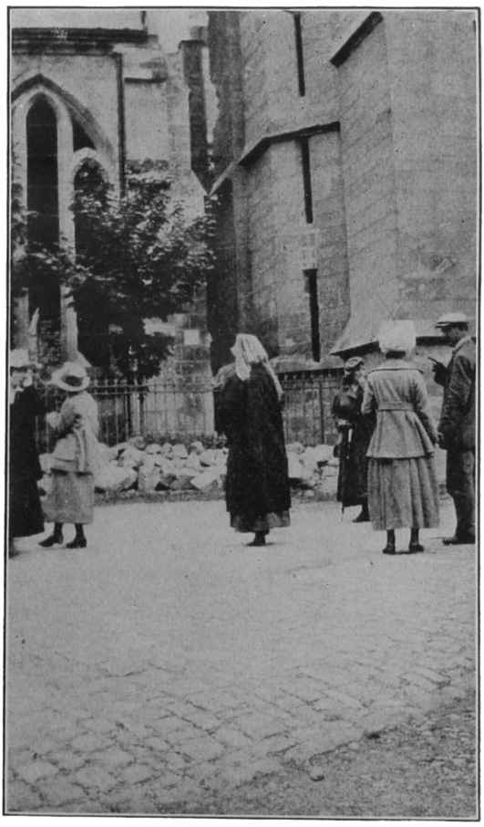 Mlle. Herzog and I started out hot-foot for the École des Mines, hoping that the work would not grudge us half an hour for satisfying our curiosity. We found a big crowd, managed by a policeman standing in front of the École, in which every window was broken. So was every window on both sides of the Boulevard for several hundred feet, and a big ragged hole beside the asphalt showed where the bomb had fallen. Things seem so different in the daytime—there were all the commonplace buildings, the tram, the policeman, the landmarks that we know so well, and yet the sidewalks were covered with broken glass and limbs of trees, and that big hole had been made by a real live Boche!