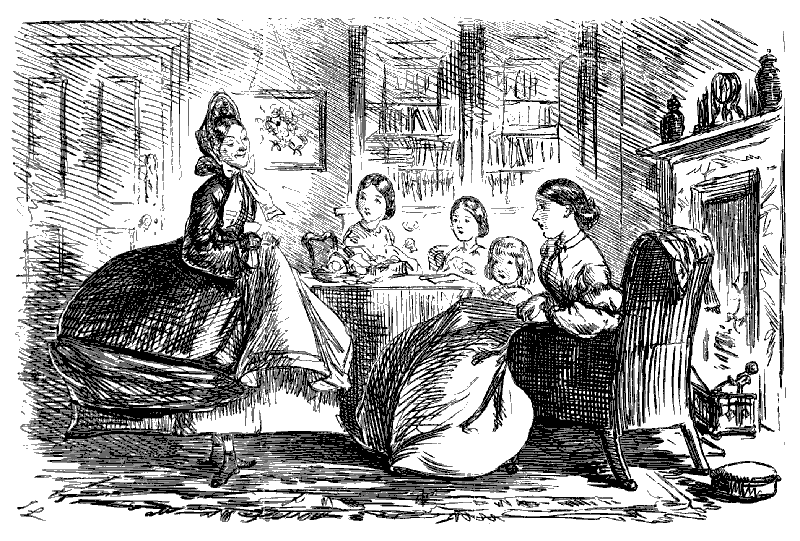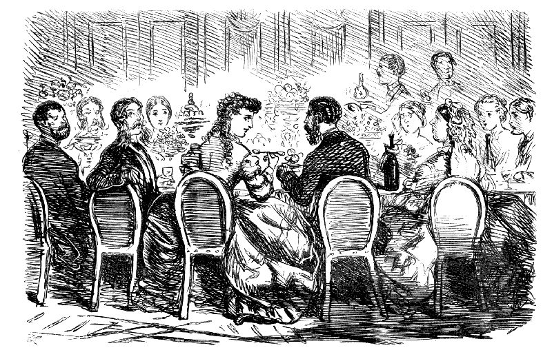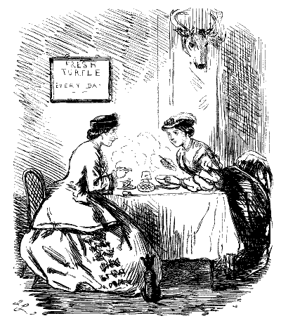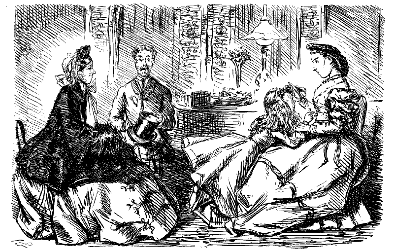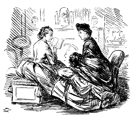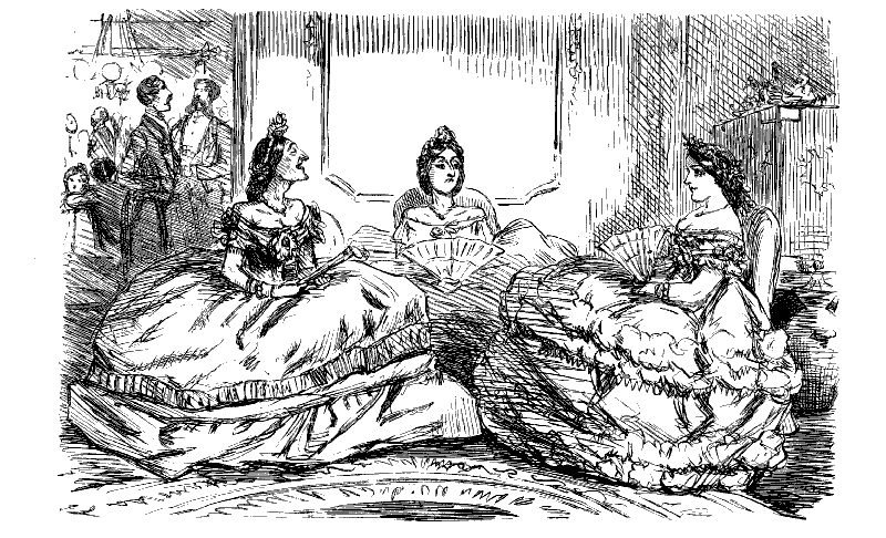 Hideous Old Lady of Fashion (with Plain Daughter). "CHARMING BALL AT SIR CHARLES'S LAST NIGHT! EVERYBODY THERE—GOOD ROOMS, NOT OVER-CROWDED—CAPITAL SUPPER! DEAREST BARBARA ENJOYED HERSELF PRODIGIOUSLY! I DON'T SEE, HOWEVER, HOW I CAN WELL AVOID ASKING HIS SISTER AND NIECE TO MY BALL, NEXT WEEK, HE IS SO FOND OF THEM; AND YET YOU KNOW THAT THEY ARE PEOPLE WHO DO NOT GO OUT NEARLY AS MUCH AS WE DO, AND ARE NOT AT ALL IN OUR POSITION IN SOCIETY!"