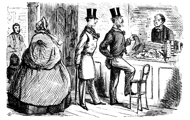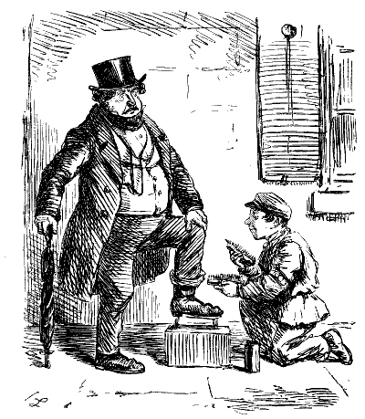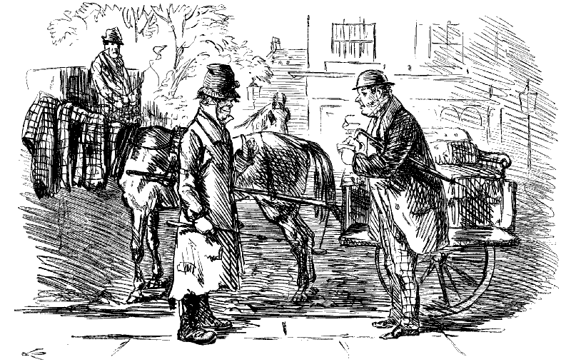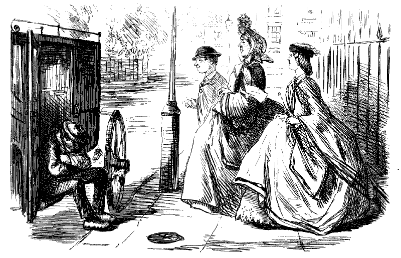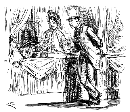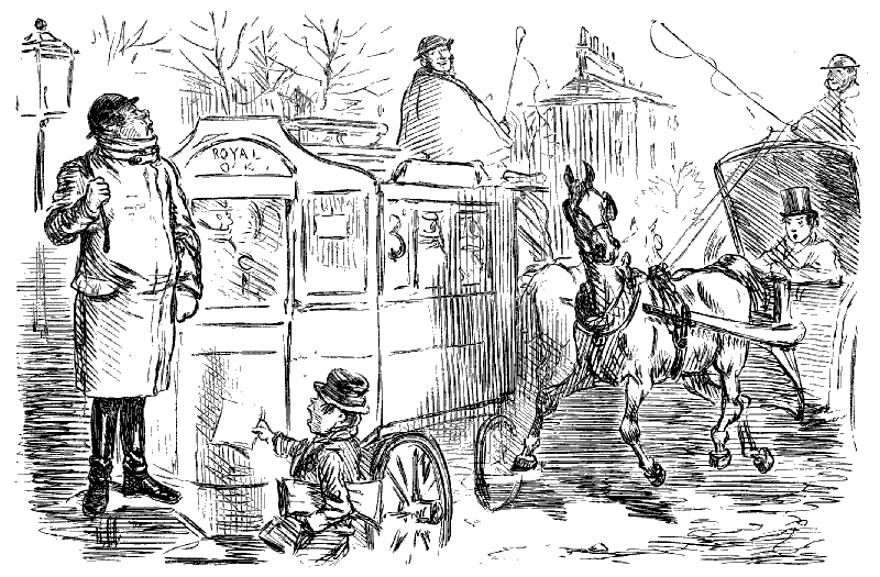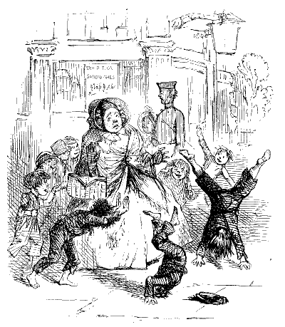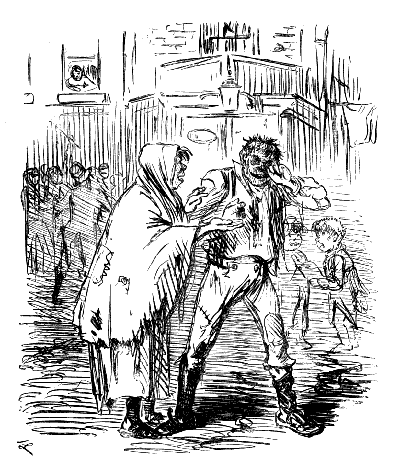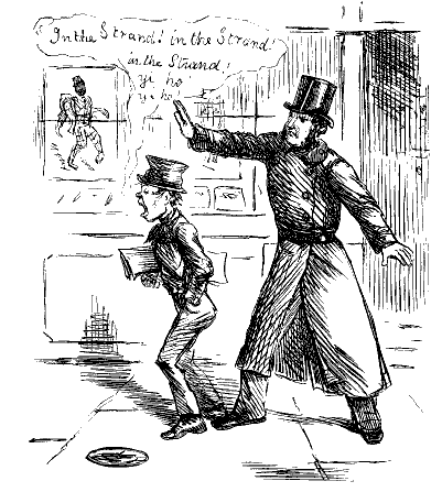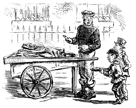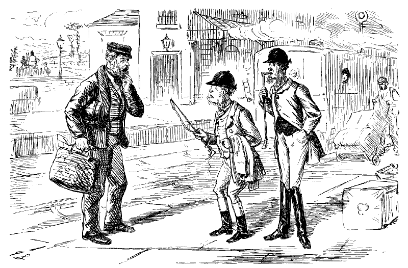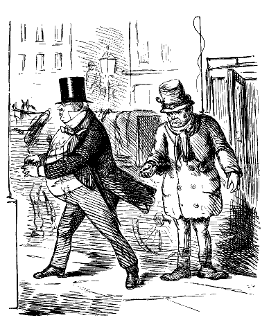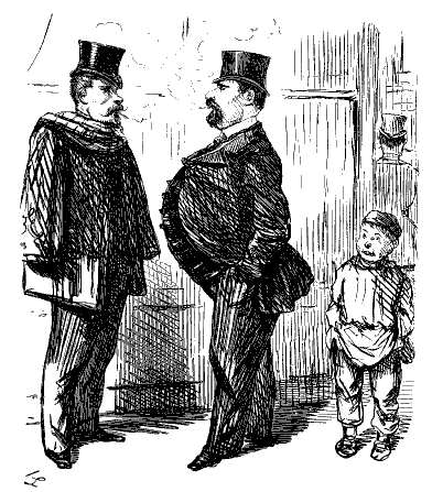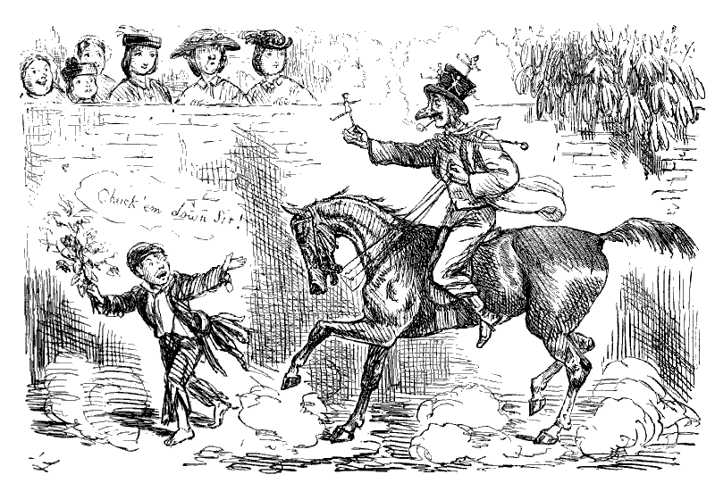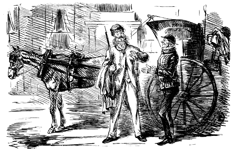 Swell (who has received Four Penn'orth of Coppers in Change). "HERE! BY JOVE, YOU KNOW LOOK HERE! HI! WHAT THE DEUCE!—I SAY—WHAT AM I TO DO WITH THESE HA'PENCE, YOU KNOW?"
