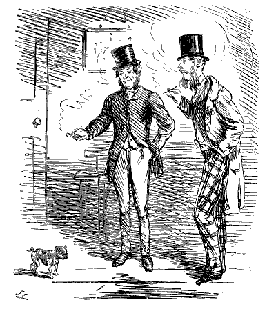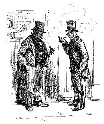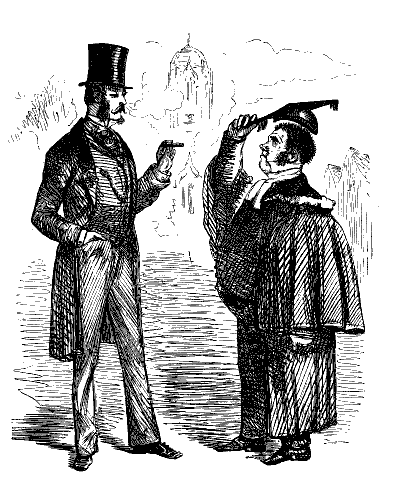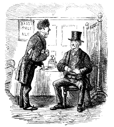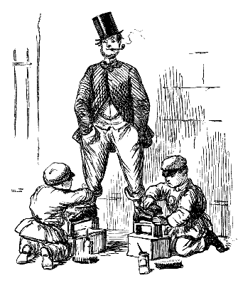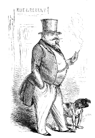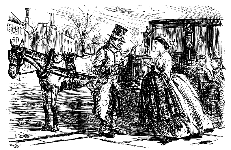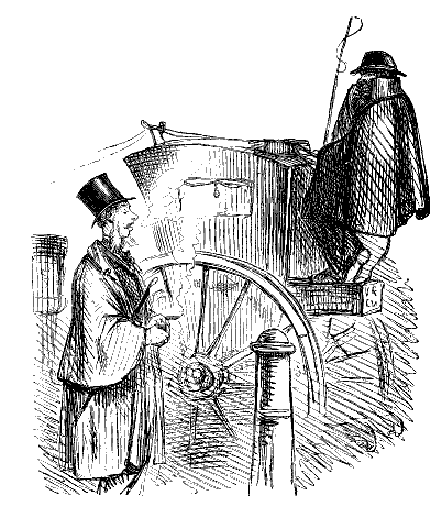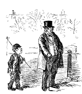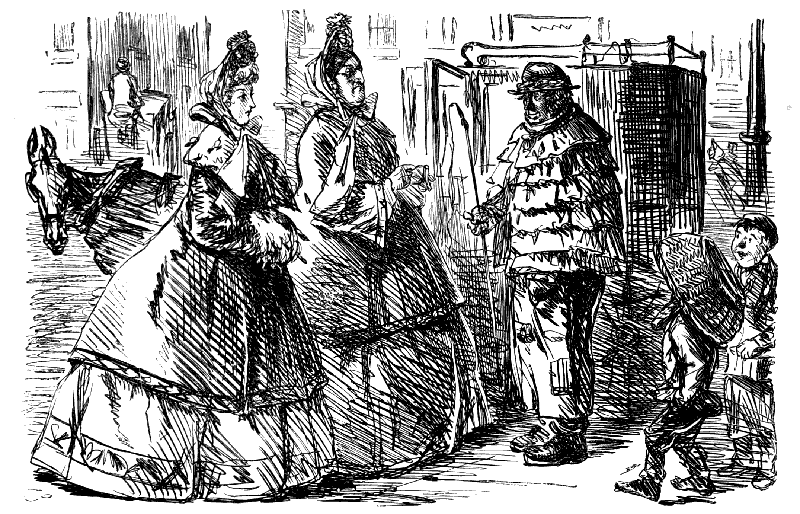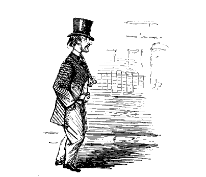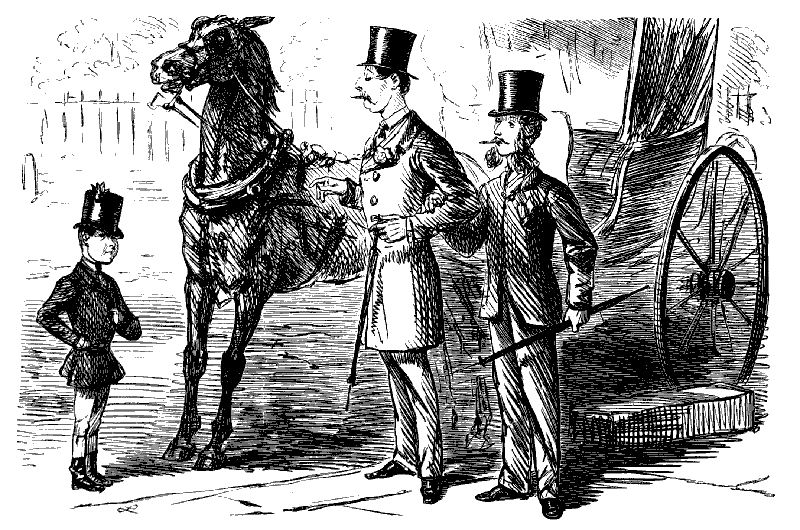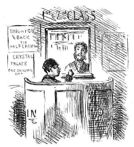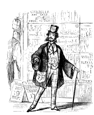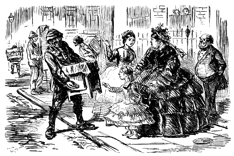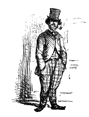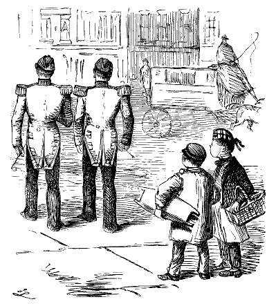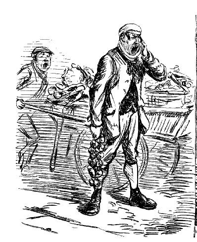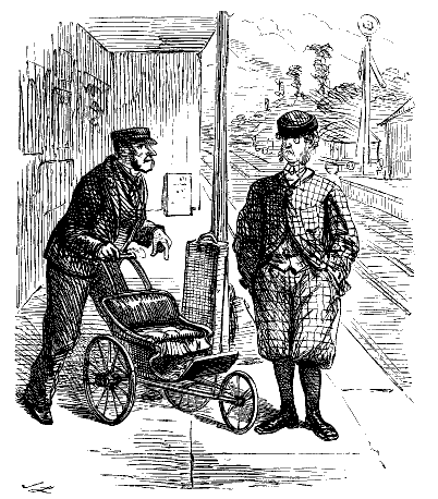 Swell (who has received Four Penn'orth of Coppers in Change). "HERE! BY JOVE, YOU KNOW LOOK HERE! HI! WHAT THE DEUCE!—I SAY—WHAT AM I TO DO WITH THESE HA'PENCE, YOU KNOW?"