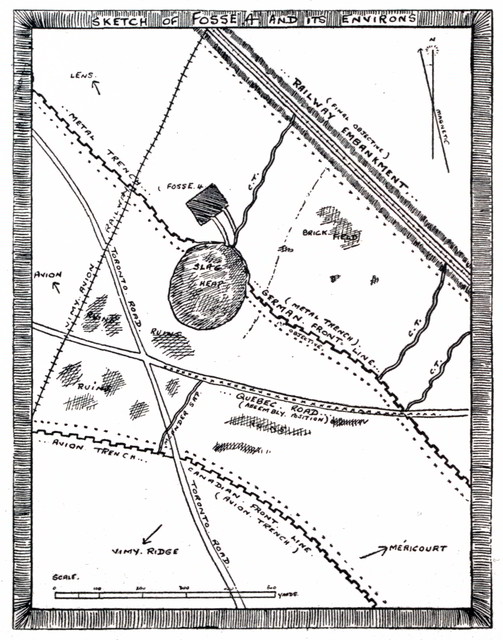 From this position, which was right on the edge of a wood (Bois Des Alleux), we had a wonderful view of Vimy Ridge, and also made an equally wonderful target for Fritz’s high-velocity gunners, who seemed to suspect, and rightly so, that that wood of ours was a good hiding place for troops. (There must have been at least two Brigades in the vicinity, to say nothing of countless ammunition dumps and big guns.) His shooting was erratic so far as we were concerned, the shells either going over our heads into the Engineers’ Camp or falling short amongst the mud holes of another battalion.