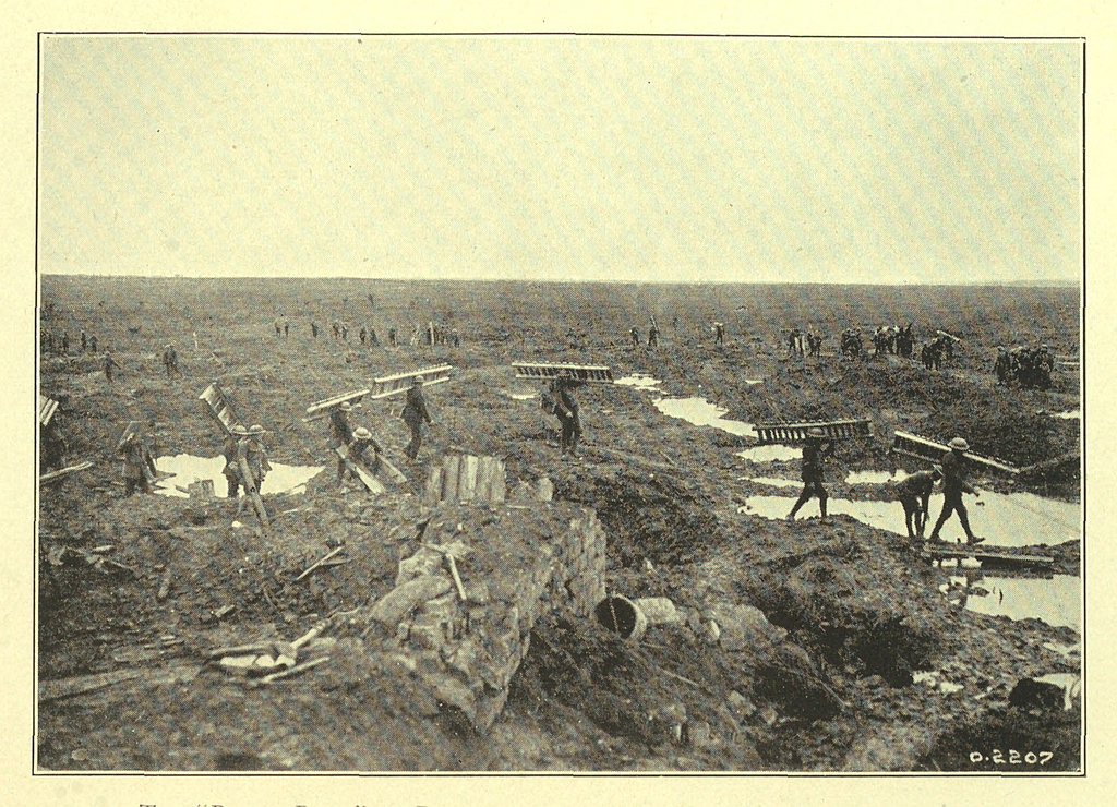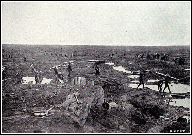 To drive him from the top of the ridge we must advance a distance of nearly three miles, uphill, over deep mud and shell holes, and through barbed wire entanglements strung across the front in a way that only Germans with a dread of British steel know how to do. Such an advance, even without a shot being fired from his lines, would be quite an undertaking; and so he sat back in his deep dug-outs around the “Zwichen Stellung,” and smiled at the idea of anyone taking that comfortable home away from him.