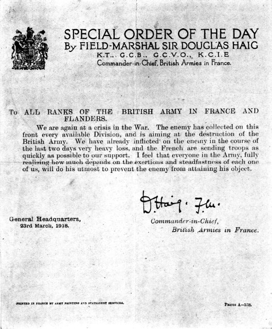 larger imageWhilst at Haillicourt the Battalion was inspected by Major-General Lipsett, G.O.C. 3rd Division, and by Lieut.-General Sir Julian Byng, G.O.C. Canadian Corps,[17] and after about two weeks’ training in the new platoon formation we were moved to Faucquenheim, in order to be closer to the other battalions of the 9th Brigade. The real reason for this move was made obvious during the next few days when orders were received on the 5th March for the Battalion to be split up in the following manner:—