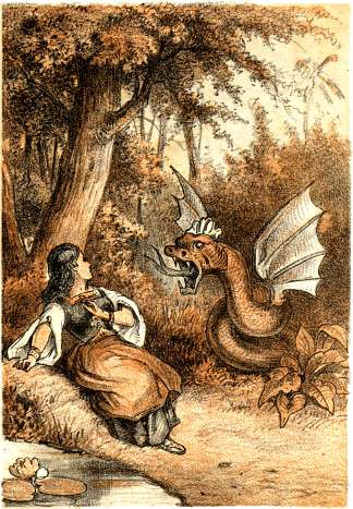 Vermoeid van het omdolen, zette ik mij in de nabijheid van de bron onder het lommer van een' boom neder. Eensklaps zag ik nu eene gevleugelde slang van verbazende dikte en lengte op mij afkomen. De slang scheen echter geen kwaad tegen mij in den zin te hebben, maar wrong en kronkelde zich in allerlei bogten, hetgeen mij deed denken, dat zij door het een of ander ongemak gekweld werd. Ik rigtte mij op, en nu bespeurde ik, dat deze slang bij den staart werd vastgehouden door eene andere, nog veel grooter, die haar trachtte te verslinden. Dit maakte mijn mededoogen gaande, en in plaats van te vlugten, had ik de tegenwoordigheid van geest en den moed, een' grooten steen, dien ik in mijne nabijheid zag, op te rapen en met alle kracht naar de grootste slang te werpen. Ik trof haar juist aan den kop, die geheel verpletterd werd. Toen de andere slang bespeurde, dat zij van hare vijandin bevrijd was, spreidde zij dadelijk de vleugels uit en vloog weg. Ik zag haar eenigen tijd in de lucht na, als een voor mij vreemd verschijnsel, doch toen ik haar uit het gezigt had verloren, zette ik mij weder in de schaduw van den boom neder, en de vermoeijenis deed mij weldra inslapen.