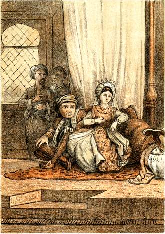 Mijne flaauwte had mij zoo verzwakt, dat ik naauwelijks kon gaan. Ondersteund door mijne slavinnen, bereikte ik echter mijne woning; doch naauwelijks bevond ik mij op mijne kamer, toen mij eene nieuwe bezwijming overviel. De oude dame verzuimde inmiddels niet, eene pleister met hare wonderzalf op mijne wang te leggen; ik kwam weder tot mij zelven, en begaf mij terstond te bed. Het was reeds nacht, toen mijn man bij mij kwam. Zoodra hij bemerkte, dat mijn hoofd met een' doek was omwonden, vraagde hij met belangstelling wat mij scheelde. Ik gaf voor hoofdpijn te hebben, en vleide mij dat het daarbij zou blijven. Maar ik had mij vergist. Mijn echtgenoot nam eene waskaars van eene der candelabers, en toen hij bijlichtte, bespeurde hij de wonde aan mijne wang, of liever de daarop liggende pleister. „Van waar deze wonde?” vraagde hij. Hoewel ik niet zeer schuldig was, kon ik echter niet besluiten voor de waarheid uit te komen; het gebeurde aan een' echtgenoot te belijden, dat scheen mij met de welvoegelijkheid te strijden. Ik vertelde hem, dat ik naar de bazar gaande, waartoe hij mij verlof had gegeven, op weg een drager had ontmoet, die eene zware vracht hout op het hoofd droeg, en zoo digt langs mij heen ging, dat een vooruitstekende tak mij het gelaat had opengekrabt, doch dat het weinig te beduiden had.