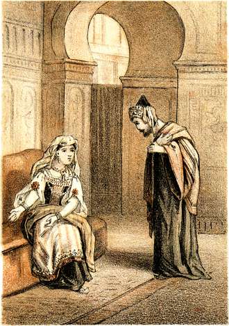 Den volgenden morgen kwam de gunstelinge van Zobeïde reeds vroegtijdig, ten einde mij te onderrigten, hoe ik mij in tegenwoordigheid van hare meesteres moest gedragen. Zij stelde mij de vragen voor, welke deze waarschijnlijk tot mij rigten zou, en gaf mij de daarop passende antwoorden in den mond. Na dit onderrigt bragt zij mij in eene zeer prachtige zaal. Ik was daar nog niet lang geweest, toen twintig reeds bejaarde, doch rijk gekleede slavinnen uit het vertrek van Zobeïde, dat aan de zaal grensde, binnentraden. Zij schaarden zich aan twee rijen ter zijde van den troon, die zich in het midden der zaal bevond. Twintig andere jonge slavinnen, die op gelijke wijze doch smaakvoller gekleed waren, volgden haar. Te midden van deze laatsten bevond zich Zobeïde, kenbaar aan hare majestueuse gestalte, en door een schat van paarlen en edelgesteenten, welke zij droeg. Zij nam plaats op den troon, en mijne beminde bleef aan hare regterzijde staan, terwijl de overige slavinnen zich op een' eerbiedigen afstand hielden.