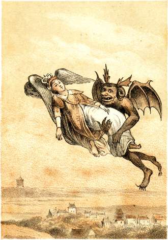 Toen zij zich tot eene aanzienlijke hoogte boven de aarde had verheven, trof een sterk vleugelgeklap haar gehoor, hetgeen haar drong, naar dien zelfden kant heen te vliegen. Al naderende bemerkte zij, dat dit geluid werd veroorzaakt door een' dier geesten, welke aan God weêrspannig zijn. Maimoune behoorde tot degenen, die door Salomo tot onderworpenheid gedwongen werden.
