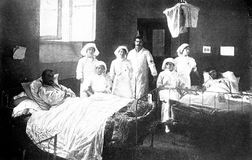 Two private motor-cars were waiting at the station to take us to the hospital. Three of our party went off in the first car, and I with the remaining soldier was lifted into the other, and carefully covered up with warm rugs by the officer who had come to meet the train. Both cars were driven off to the hospital, where my companions were to be lodged. The sun was shining frostily as we drove through the bright clean town, which is more Dutch than German in appearance.