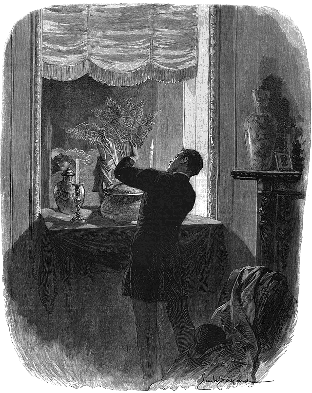 Une glace sans tain s'ouvrait au-dessus de la cheminée dans le mur qui séparait la chambre du cabinet, masquée par un store à l'italienne à ce moment à demi baissé: dans la chambre deux lampes et une statuette garnissaient la tablette de cette cheminée; dans le cabinet c'était un vase avec une fougère et deux flambeaux.