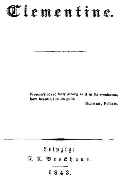 Nicht weiter, ich beschwöre Dich, flehte Clementine, ach! Meining liebt mich, ich weiß es – dringe nicht in mich, jetzt nicht – verlasse mich nur jetzt, nur heute, mein einzig Geliebter – morgen hörst Du von mir – gewiß, nur jetzt gehe – eile, mein Robert, ich bitte Dich.